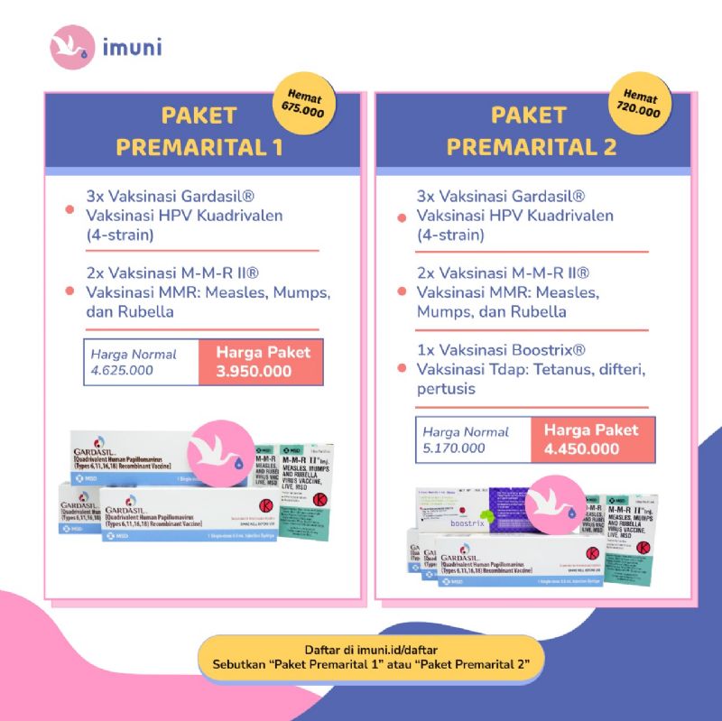 Vaksinasi lebih aman, lebih nyaman, dengan harga yang lebih terjangkau bersama imuni @imuni.id, layanan vaksinasi di rumah untuk Anak dan Dewasa. Vaksinasi diberikan 100% oleh dokter yang terlatih vaksinasi dan vaksinologi.